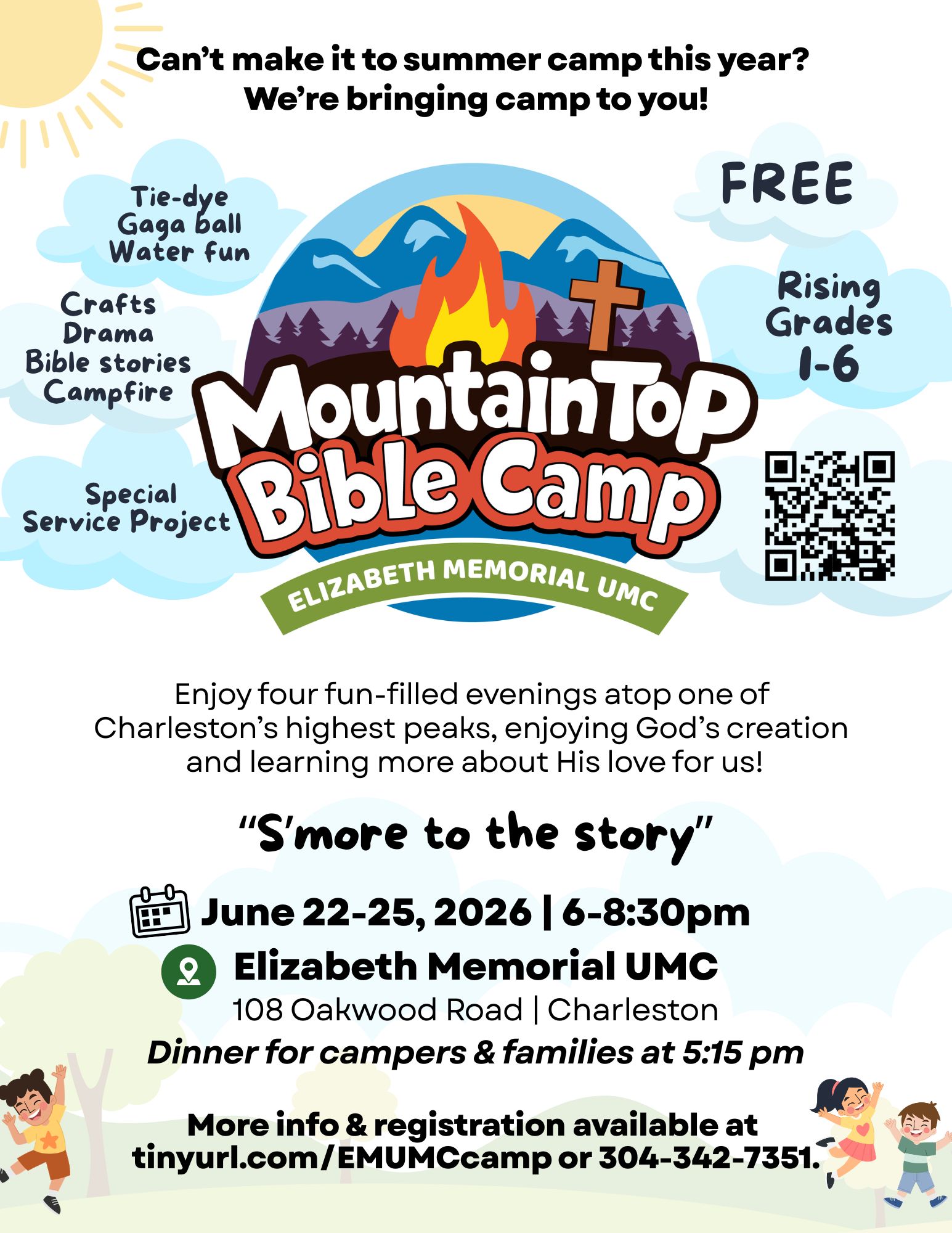 Elizabeth Memorial United Methodist Church is bringing summer camp to elementary age children across our area through Mountaintop Bible Camp! Join us for four fun-filled evenings atop one of Charleston’s highest peaks, enjoying God’s creation and learning more about His love for us.